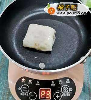 7面煎黄后拿到案板上,把煎的最好的地方切成一个正方形。这时候不要吃。