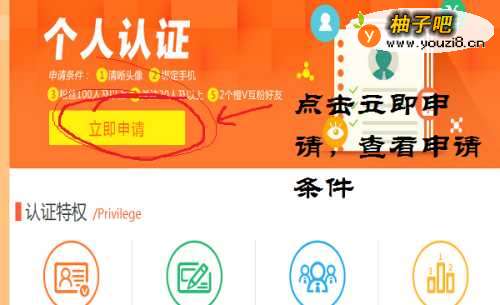 6点击“个人认证”,进入个人认证界面,查看认证后的特权,之后点击“立即申请”进入申请环节。