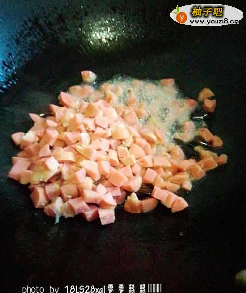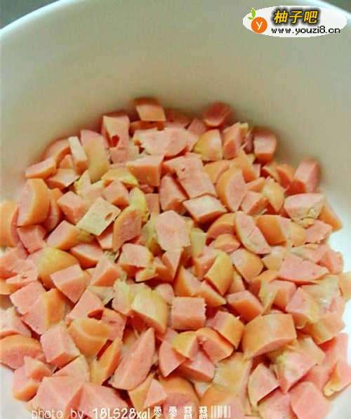 脆皮肠洗净后,切丁备用;切的时候要注意,不要划到手;