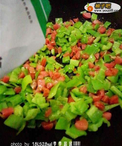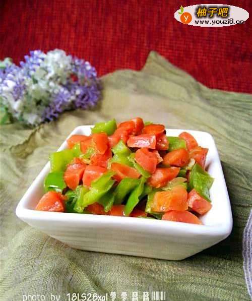 我喜欢吃脆皮肠,但是LG不喜欢,不到万不得已,他是不会拿脆皮肠做菜的。这次就是万不得已的一次,青椒切丁,脆皮肠切丁,炒啊炒,最后LG冒出一句:“脆皮肠还挺好吃的嘛。”