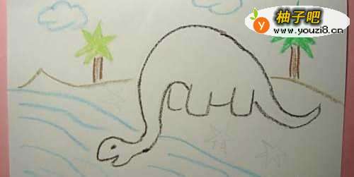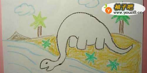 用蜡笔的形式来绘画深受孩子们喜欢,在白纸上用黑色蜡笔绘制图形的轮廓线,接着用不同颜色的蜡笔来涂色,这样画的图形颜色丰富,色彩亮丽有特点,看起来画面有感染力和很强的画面感,给人印象深刻。这里给大家分享一个用蜡笔画喝水的小恐龙,喜爱绘画的朋友们,跟着步骤一起来画画吧。