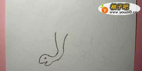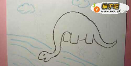 2接着,用黑色蜡笔画出喝水的小恐龙的身体和腿脚的图形部分,并画出小恐龙的尾巴图形,如下图所示。