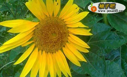 2向日葵花的枝叶有大大绿色的叶子托着黄色的花瓣,就是样黄色的花蕊内的果实成熟,