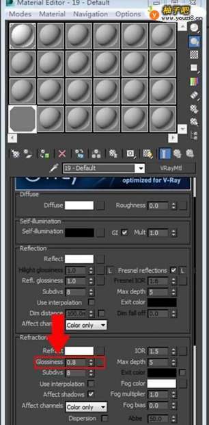 7如果想渲染毛玻璃,如图把“折射率”下面的Glossiness改小,数值根据需要调试,我这里调0.8