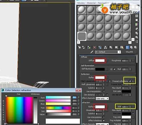 3我们打开材质编辑面板,如图所有红色线框都改成”255“的纯白色,从上到下依次是”漫反射“”反射率“和”折射率“。漫反射就是颜色,玻璃没有颜色自然是纯白,反射率是反射影像的大小,折射率就是透明度的大小。第一个黄框是”菲涅尔反射“要打勾,它可以让反射更自然(塑料和玻璃打勾,不锈钢则不打勾),下面的IOR是折射率,普通玻璃的折射率为1.5.