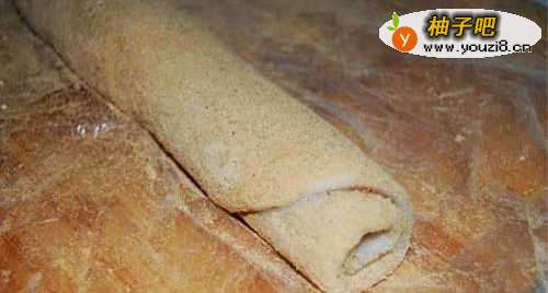 5用手将糯米卷整理成粗细均匀的条状,用刀切成小段即可。