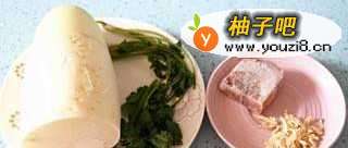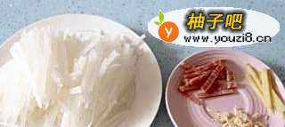 2白萝卜去皮切丝,火腿切丝 虾米浸泡清洗后滤干水分