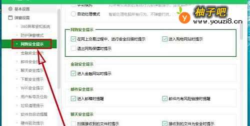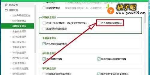 6然后找到【进入购物网站时提示】选项,在这里将它前面的复选框打上勾,这样,360安全卫士进入购物网站时提示选项就开启了。