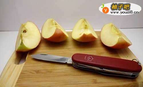2用水果刀把苹果切成月牙状,也可以切成苹果丁,像图中那样