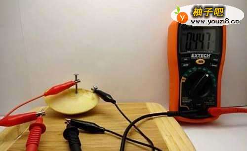 4把铁钉和镀锌螺丝插在苹果上面,像图中那样,这时我们可以测得电压为0.447V