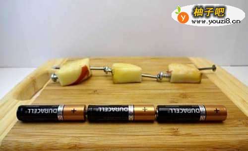 水果电池是利用水果中的化学物质和金属片发生反应产生电能的一种电池。它的制作方法也是很简单的,把两种不同的金属插在水果里面就可以了,两种金属的活泼性相差最好比较大一点比如铜和锌。