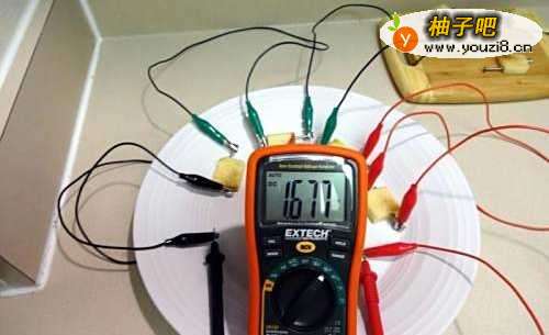 7我们用万用表可以测得串联之后的水果电池所产生的电压为1.6v,如果我们想要得到更高的电压我们可以继续串联,或者更换金属