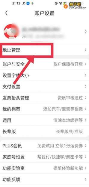 3手机页面这时会呈现账户设置页面,点击地址管理选项;