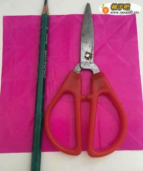 第一步 把一张16厘米X16厘米的正方形二红色彩纸 从下向上对边折叠整齐
