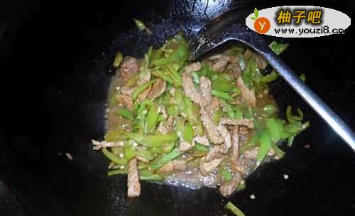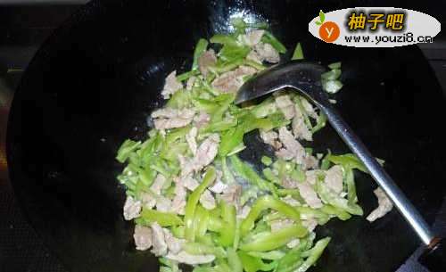 4放入青椒,翻炒至青椒出现香味,放入少量酱油,调色调味。