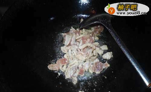 3锅中放入少量的花生油,放入葱姜,待炒出香味,倒入准备好的肉丝,炒至断生。