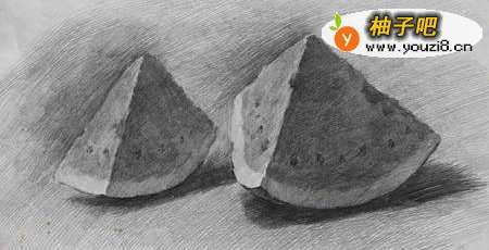 4【4】画好西瓜的明暗交界线后,过渡到它的暗面,画好暗面和投影,注意暗面也是有层次变化的