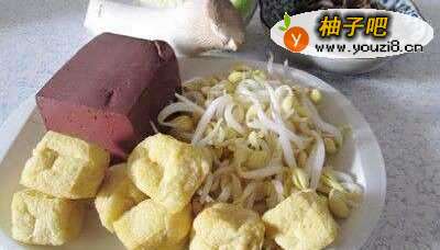 6下入焯水的鸭血,煮至2分钟,再下入豆泡和杏鲍菇,最后下入百叶,稍微煮一会。