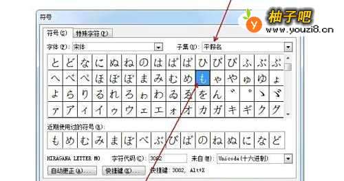 4在“子集”中选择“平假名”,并在下方选中平假名も,点击“插入”。