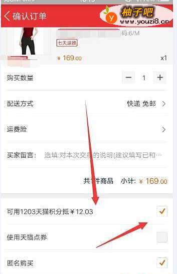 10当我们点击某款商城产品进入提交订单页面时也可以使用天猫积分抵扣一部分的钱,如图所示,勾选使用天猫积分抵扣选项。目前天猫积分抵扣比例为100分等于1元钱。