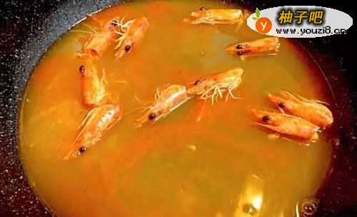 鲜虾去头挑肠泥,粉丝剪半泡水备用,锅里热油下虾头炒香,等变色后倒入1杯半水煮个2分钟。