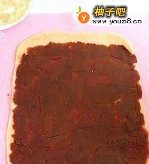 5微波好的黄豆粉微微放凉后撒在案板,把蒸好的面团取出,放在案板上擀成5mm厚的面饼。