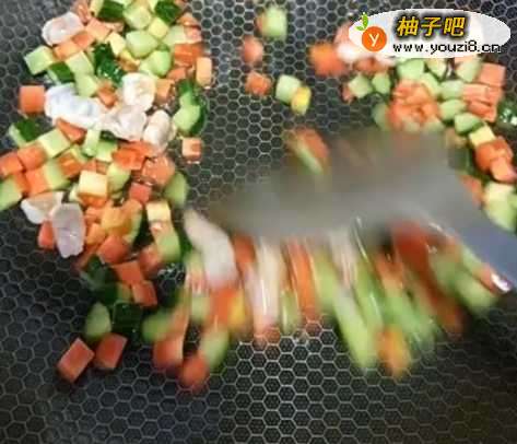 2起锅热油,将切好的黄瓜、胡萝卜丁下锅;