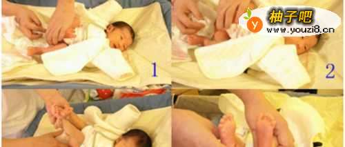 在换尿布前将干净的尿布、隔尿垫、婴儿专用毛巾、护肤柔湿巾、装好的40度左右温水等准备好,以备更换尿布时使用。并且要清洁好双手。然后将宝宝平放于地板、床或小桌上,使其感觉舒适安全。当然前提下面可以先垫上事先准备的隔尿垫,以防在换尿布的时候宝宝突然尿尿,另外需要注意的是要时刻用手保护宝宝的身体以免摔伤。打开尿布,如果已经有拉粑粑,那要先用沾水后的毛巾或护肤柔湿巾轻轻擦拭宝宝的阴部和臀部。擦干净后用手托起婴儿的腰部,把他的臀部放在准备好的干净尿布的中间位置;再对折过来;把尿布一端在肚脐处下方折过来(新生儿则反之);最后系住尿布。如下图操作: