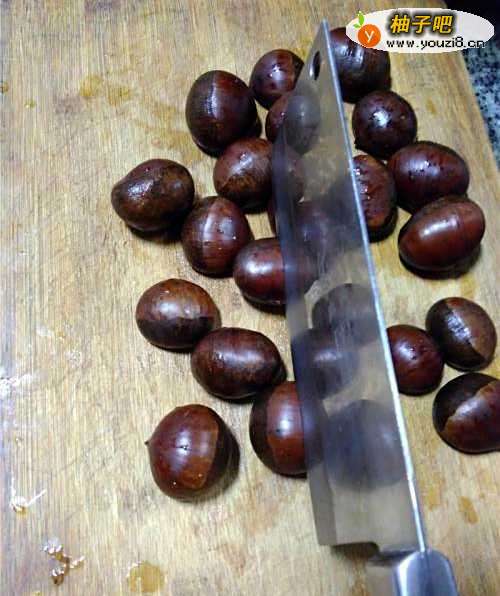 2板栗洗净,用刀口在板栗背上划两道口子。一定要划破里面的板栗衣。