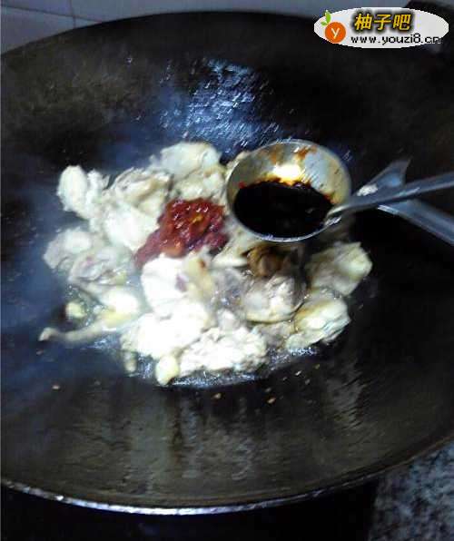 7鸡肉炒变色后,放入豆瓣酱,酱油,翻炒均匀。