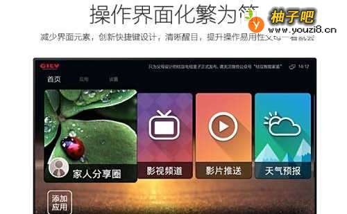 2子女通过“桔豆盒子”公众号可以发送照片/视频/语音,以及点播影视到远方父母的电视机上,爸妈打开电视首页的“家人分享圈”和“影视推荐”,就能直接看到家人分享的点滴以及推送的电视节目。