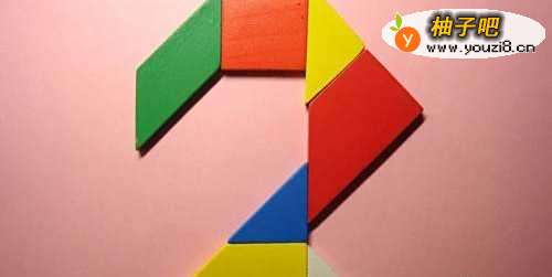 6最后,取蓝色的三角形板与紫色的三角形板连接,并摆放在白色三角形板的右边,拼接位置,如下图所示。这样数字2的图形就拼好了。可以让孩子仔细看一遍后,自己动手拼图,并不断回忆拼图的顺序,这可以锻炼孩子的记忆能力。培养孩子的过目不忘的能力,对孩子以后的学习有帮助。