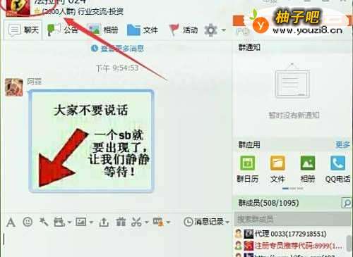 2现在就来到了群聊天对话框,在聊天窗口的左上角的群名字,直接点击鼠标左键打开群资料卡