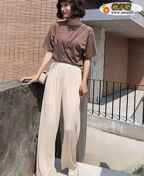 搭配二:米白色冰丝裤+深咖色长袖T恤米白色、咖色等奶茶色系的颜色是最近很流行的,米白色冰丝裤搭配一件深咖色长袖T恤,特别显高挑。