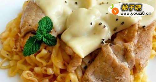 1.猪里肌薄片用肉槌拍松后切成适口大小,放入盒中,倒入盐水后腌渍至少2小时。2.煮一锅滚水,放入蒸煮面煮熟后,捞起备用。3.锅中倒入少许油热锅,放入腌好的肉片(不用冲洗),盖上锅盖闷煮至半熟后加入蘑菇酱、香菇素蚝油、黑胡椒及蒜粉拌炒均匀。4.加入面条,用筷子拌炒让面条沾附酱汁,若太干可加些煮面水调整湿度。5.盛起面条与猪肉片,再放上一片起司片即可。