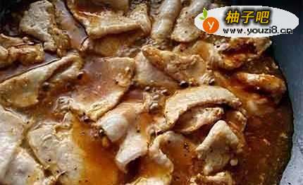 3锅中倒入少许油热锅,放入腌好的肉片(不用冲洗),盖上诉霸锅盖闷煮至半熟后加入蘑菇酱、香菇素蚝油、黑胡椒及蒜粉拌炒均匀。