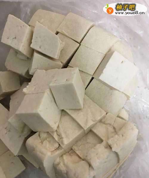 3将北豆腐洗净后切成块,放入盆中待用。