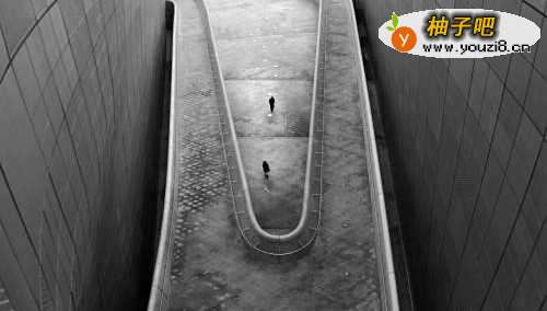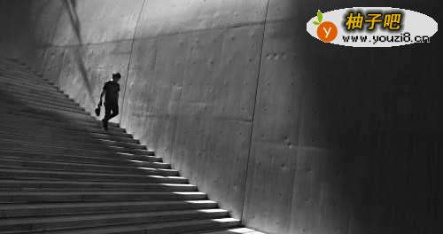 4在拍摄完人们上下台阶的动作后,可以把照片调成黑白色调,可以得到一张高冷都市风格的照片。(参考照片, D-2)
