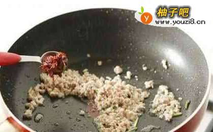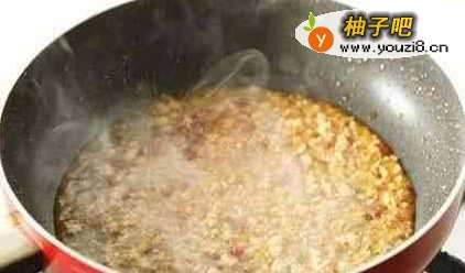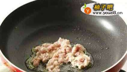 2锅内倒油,爆香葱姜蒜后倒入肉沫,煽炒出油来
