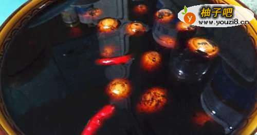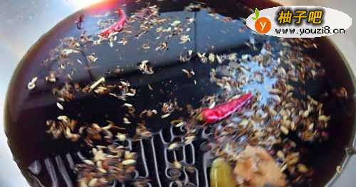 4另起一锅,加半锅水,倒入老抽、盐、白糖,放入花椒、茴香、香叶和干辣椒