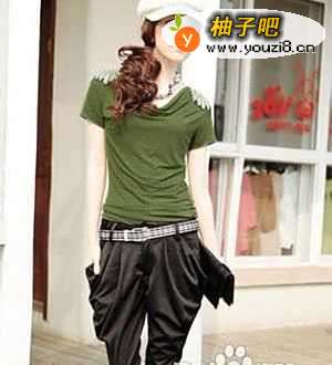 欧美风格的T恤可以说是上身丰腴美女的必选,无论是材质的选择还是完美的剪裁,都能很好的掩饰住多余的肉肉。特别是堆堆领的设计以及精致的手工订珠,还有肩部的枫叶装饰使整体T恤更显别致。这样的T恤不管是搭配哈伦裤还是短裤都是很不错的选择,而图中这样一款上等做工的哈伦裤,这样的搭配由不得穿者不获得高回头率。