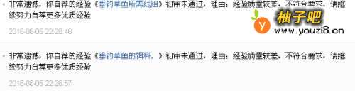 1、非常遗憾,你自荐的经验《垂钓草鱼所需线组》初审未通过,理由:经验质量较差,不符合要求,请继续努力自荐更多优质经验。2、你自荐的经验《垂钓草鱼的饵料。》初审未通过,理由:经验质量较差,不符合要求,请继续努力自荐更多优质经验3、你自荐的经验《怎么垂钓草鱼》初审未通过,理由:经验质量较差,不符合要求,请继续努力自荐更多优质经验。有图为证。