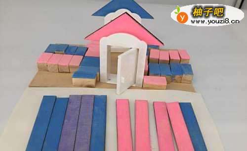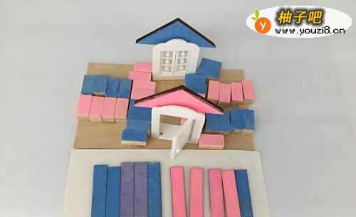 3在两边粘好木块,再粘门,门的两边一样粘上木块,然后在门、窗上面粘上三角板、三角板上粘上长方形木片当瓦片。