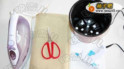 麻布一块,剪刀,熔胶枪,花盆,烫斗