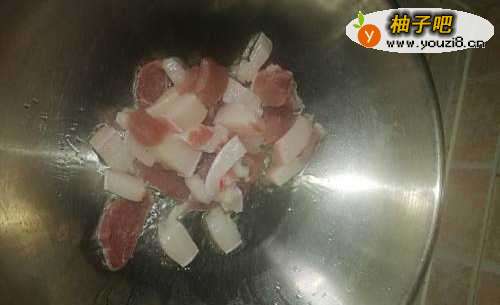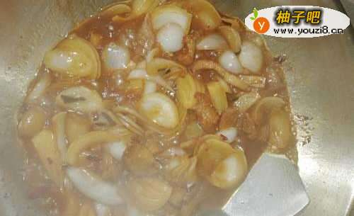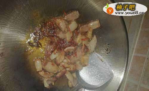 7猪肉变色后,加入料酒、醋、盐、豆瓣酱等,继续翻炒。