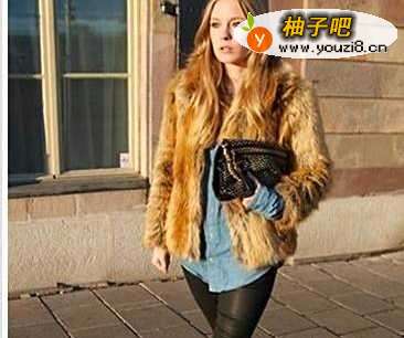 奢华感的黄色皮草外套,内搭牛仔衬衫,下穿黑色皮裤,皮革黑色短靴,帅气十足,非常简约干练,成熟女性风十足。