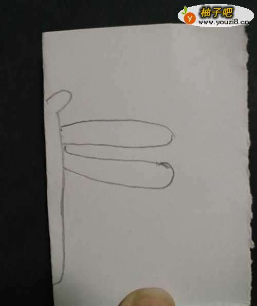 3第三步,把折叠好的纸开口向右边,然后画出蜻蜓的身体部分。