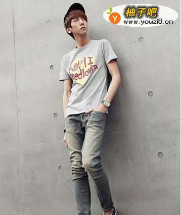33、如果性格偏外向,可以穿圆领或V领T恤,酷酷拽拽的那种风格,个性的色彩和图案,配水洗磨破牛仔裤,下面穿球鞋或者高帮靴子,很帅!!