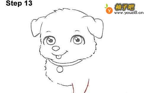 12第12步:在左侧的头部下方,为卡通小狗的胸部绘制一条向右弯曲的线条。打破这条线,使其锯齿代表毛皮。