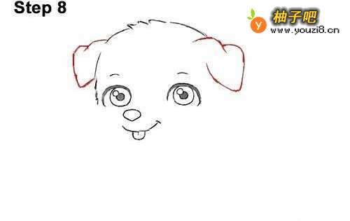 8第8步:在头顶两侧画耳朵。耳朵的形状由顶部的几条曲线和底部的V形线组成。由于视角的原因,右侧的小狗耳朵应该比左侧的耳朵大一些。
